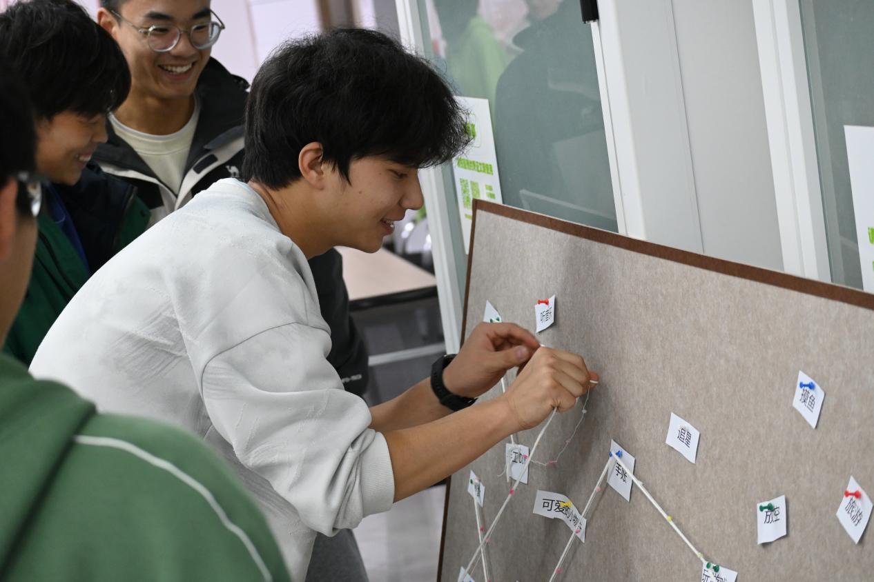 活动伊始,主持人闫春泽同学详细介绍了各环节的活动规则与设计理念,引导同学们以开放的心态投入体验。随后,在志愿者的引导下,“毛线缠绕”环节率先拉开帷幕。现场摆放着写有“运动”“阅读”“桌游”“编程”等各类课外活动名词的卡片,同学们手持彩色毛线,在自己感兴趣的名词卡片间穿梭缠绕,丝线交织的瞬间,不仅串联起共同的兴趣爱好,更自然调动了现场的交流氛围。大家围绕卡片上的话题畅所欲言,分享自己的课余生活与兴趣感悟,在轻松的互动中逐步敞开心扉,打破陌生感与隔阂感。
